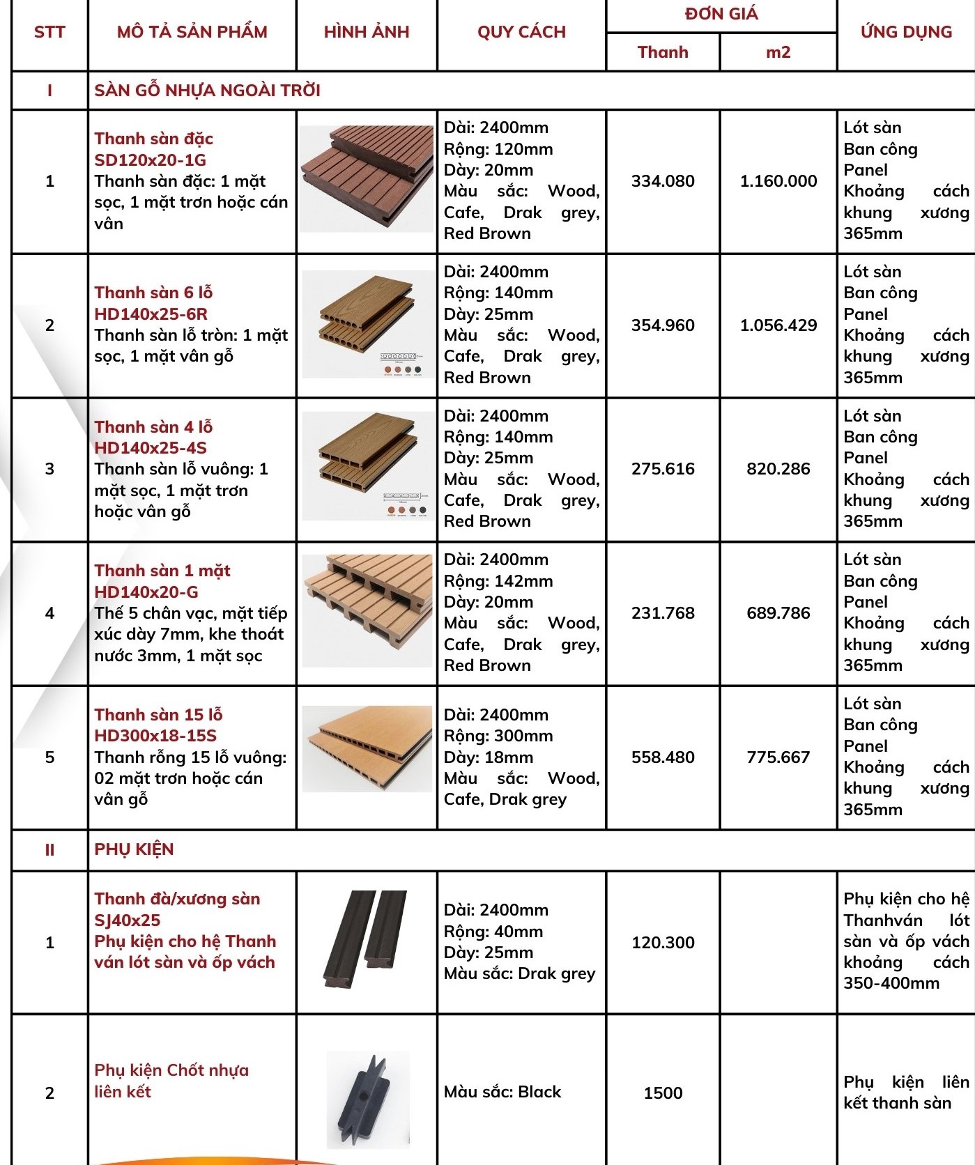Sàn gỗ nhựa ngoài trời là sự lựa chọn lý tưởng cho các không gian ngoại thất như sân vườn, nhà hàng và khách sạn. Với tính năng đa dạng, cấu trúc bền bỉ và khả năng chống chịu thời tiết khắc nghiệt, sàn gỗ nhựa ngoài trời không chỉ mang lại vẻ đẹp cho không gian mà còn đảm bảo an toàn và tiện nghi cho người sử dụng. Hơn nữa, giá cả của sàn gỗ nhựa ngoài trời có sự biến động tùy thuộc vào loại hình và chất lượng vật liệu, cũng như các yếu tố bổ trợ như khung xương và chi phí thi công. Việc lựa chọn sàn gỗ nhựa ngoài trời phù hợp và đáp ứng yêu cầu của công trình là rất cần thiết để đảm bảo thành công cho dự án.